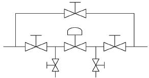 調(diào)節(jié)閥在使用過程中難免會(huì)出現(xiàn)些問題,為能及時(shí)處理調(diào)節(jié)閥故障隱患,在工藝管路上一定要增加旁路閥與前后截止閥,以便能將調(diào)節(jié)閥從工藝系統(tǒng)中切除處理。而在切斷管路時(shí)管內(nèi)不可避免的積有帶壓流體,因此必須在調(diào)節(jié)閥前后裝設(shè)放泄閥,如圖1。