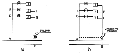 ?。?)對(duì)于具有多個(gè)支路的環(huán)路,裝設(shè)ZY47型自力式壓差控制閥,可以達(dá)到兩個(gè)目的:a、吸收外網(wǎng)的壓力波動(dòng),使被控環(huán)路的水力工況不受外網(wǎng)壓力波動(dòng)的影響。b、削弱各支路間的調(diào)節(jié)干擾(即一個(gè)支路的調(diào)節(jié)對(duì)其它支路的流量所產(chǎn)生的影響)。對(duì)于第a條是顯而易見的;對(duì)于第b條,這里與裝設(shè)手動(dòng)調(diào)節(jié)閥作一個(gè)對(duì)比分析。
